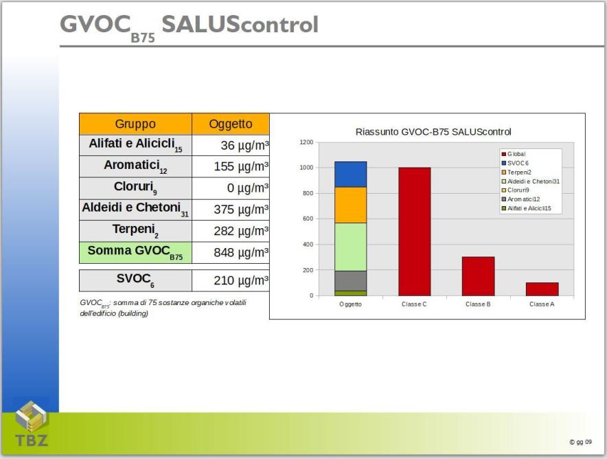 La misura viene eseguita con una procedura normata, che può scaricare qui. Il risultato della misura si riassume in un istogramma GVOC (Global Volatile Organic Compounds, che include molto più sostanze del normale gruppo TVOC). Download presentazione della misura SALUScontrol.